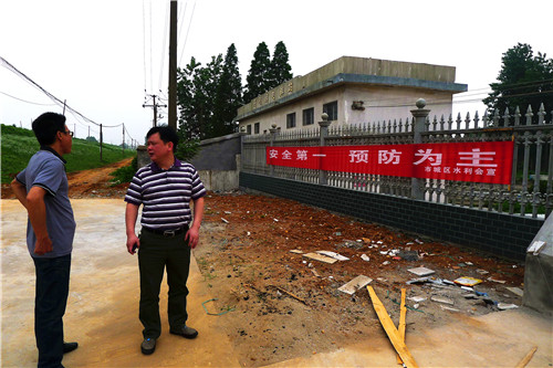 圖為市水利局長胡經(jīng)緯、分管安全生產(chǎn)的副局長涂鴻雁及相關(guān)人員在觀看安全生產(chǎn)宣傳板報(bào)和工作督查